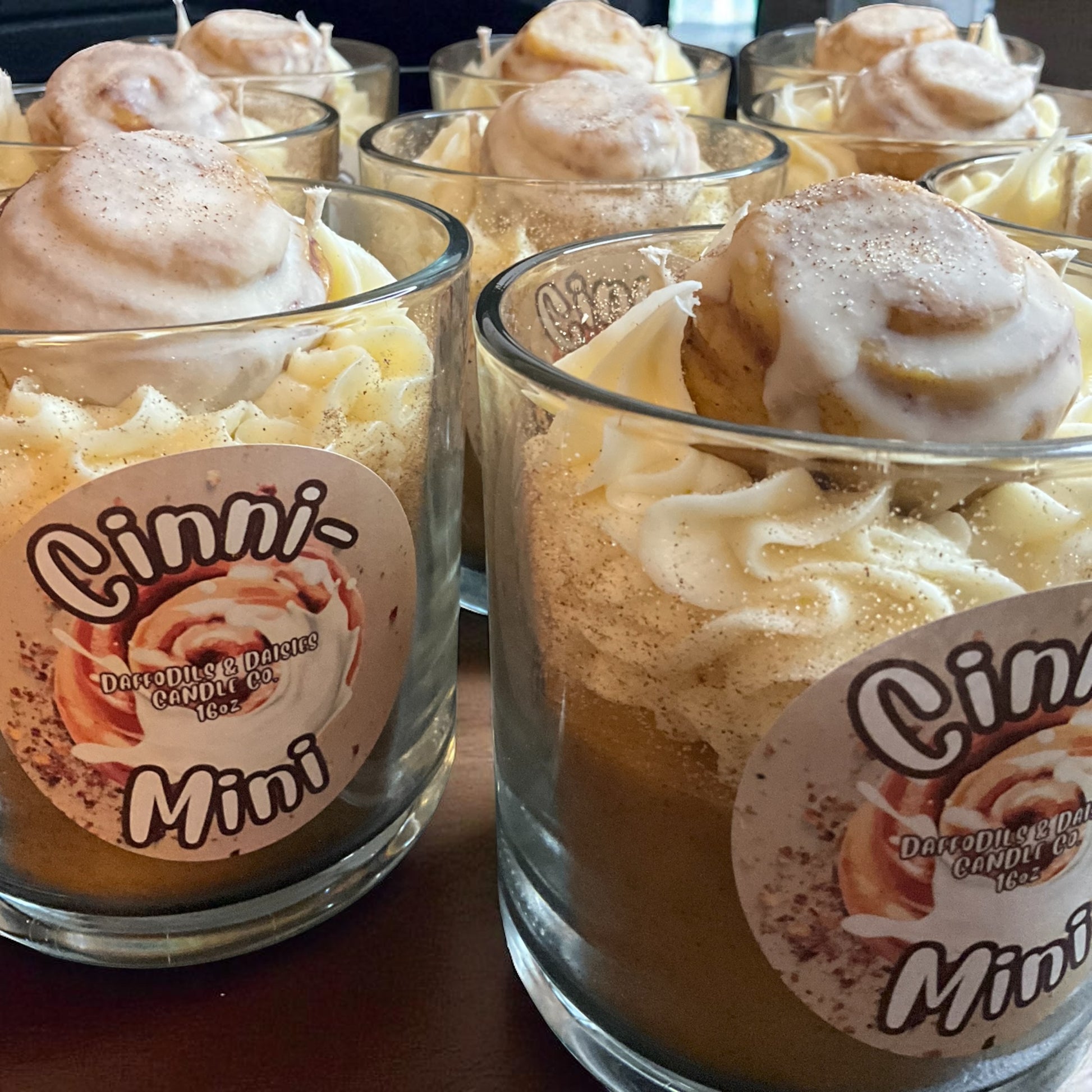 Our Cinnimini Candles are full-sized dessert-style candles topped with the cutest little mini cinnamon rolls. Each one is carefully handcrafted to look just like a bakery-fresh cinnamon bun, complete with warm swirls and drizzled icing. The fragrance is rich, sweet, and cozy — just like pulling gooey cinnamon rolls fresh from the oven.